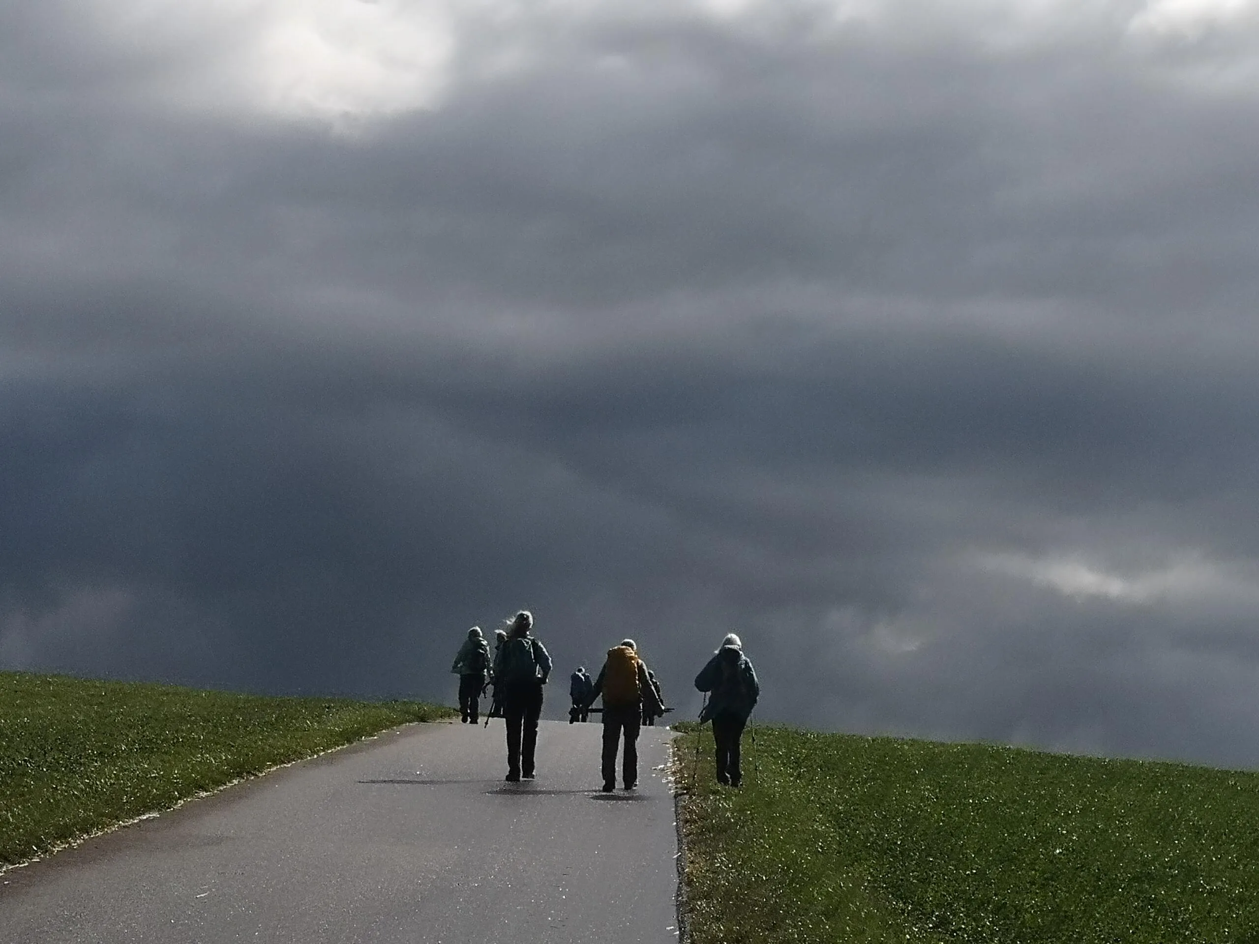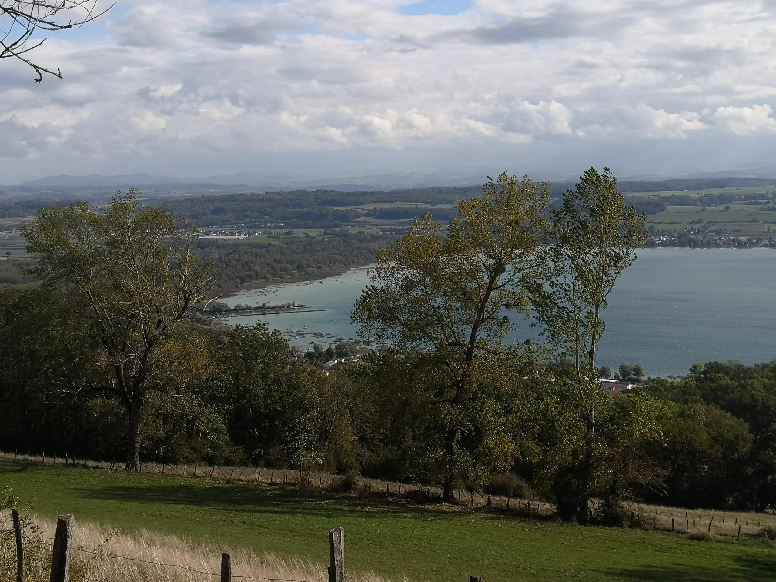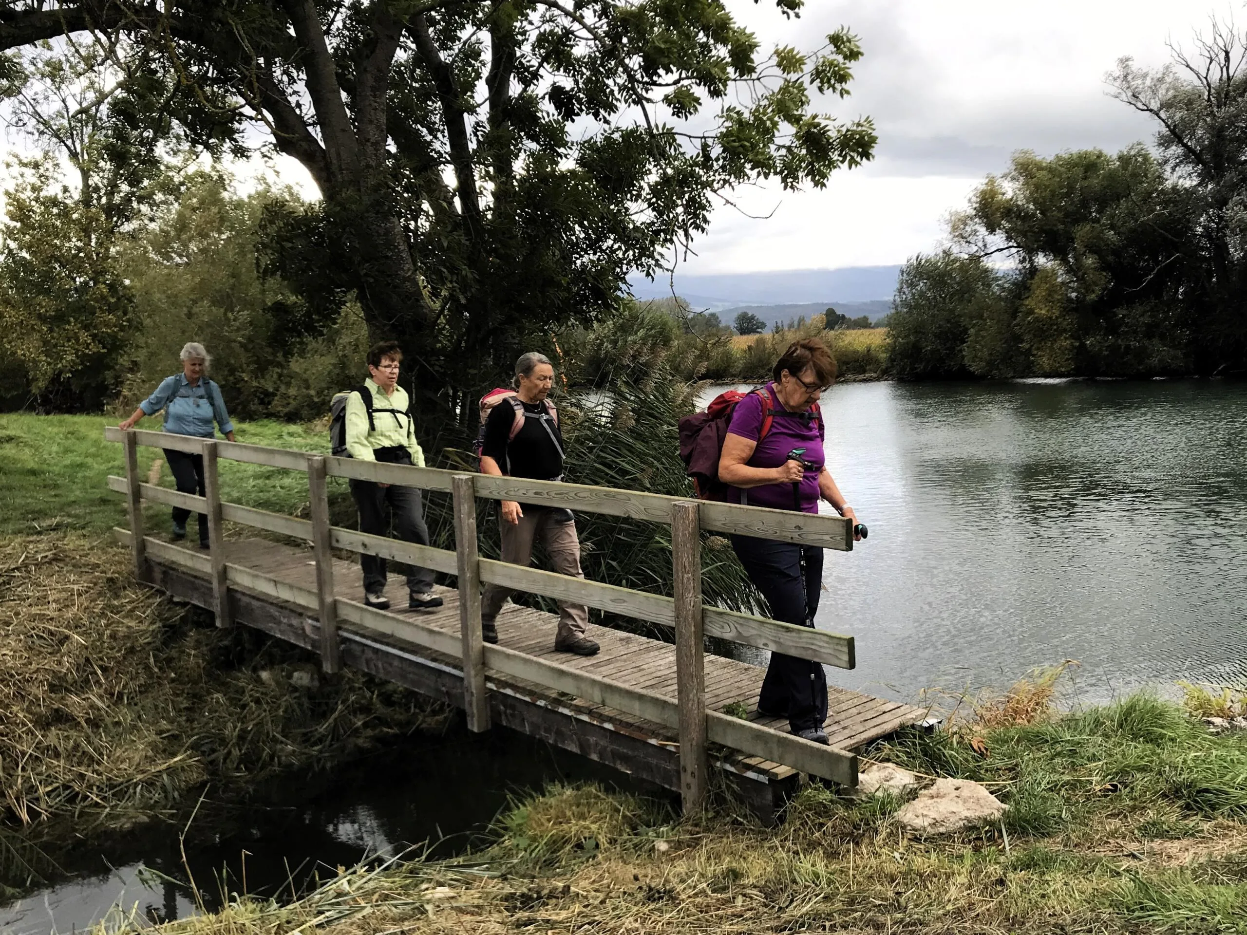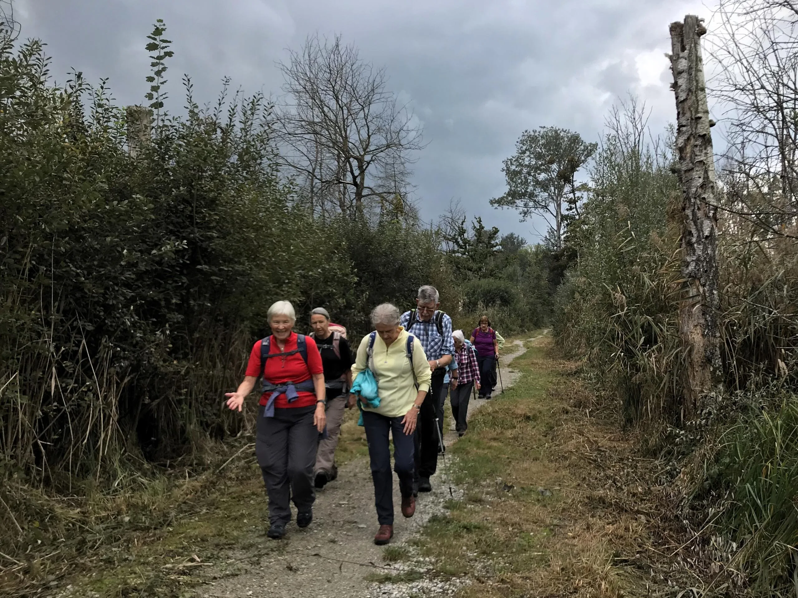 Um 09.00 Uhr treffen sich am Bahnhof Bern 11 Wanderfreudige. Der Wetterbericht prophezeit Regen… die Natur kann ihn gebrauchen. Wir fahren bis Cudrefin am Neuenburgersee, dort gibt’s wie üblich mal Kaffee. Regenschutz brauchen wir noch nicht. Zuerst wandern wir etwa 3 Kilometer dem See entlang bis La Sauge. Hier ist das Naturschutzgebiet der Grand Cariçaie, ein wichtiges Zwischenziel für die Vögel. Zwei Männer von uns versuchen die gerade Strecke in der halben Zeit zu laufen…. Sie warten jedoch schon auf die etwas Langsameren… Bald geht’s dem Broyekanal entlang. Die Wolken werden schwärzer und die ersten Regentropfen fallen. Doch es lohnt sich kaum, den Regenschutz anzuziehen. Vor dem Mont Vully machen wir Mittagshalt. Nach kürzerem Aufstieg sind wir bald auf dem Plateau oben mit den riesigen Ackerflächen. Im Westen werden die Wolken immer schwärzer, betrifft uns aber nicht. Es gibt noch einmal eine Pause bei den Überresten der Helvetier, die da mal gehaust haben. Nun wechseln wir auf die Murtensee Seite. Es geht ziemlich steil hinab durch die Rebberge. Bald ist Sugiez erreicht, natürlich darf dort ein Gâteau de Vully nicht fehlen…. Mit dem Zug geht’s wieder heimwärts. Danke an Kurt für die Organisation, jemand hatte auch noch mit dem Petrus geredet und uns kaum Regen trotz den Wetterprognosen beschert. K.F.