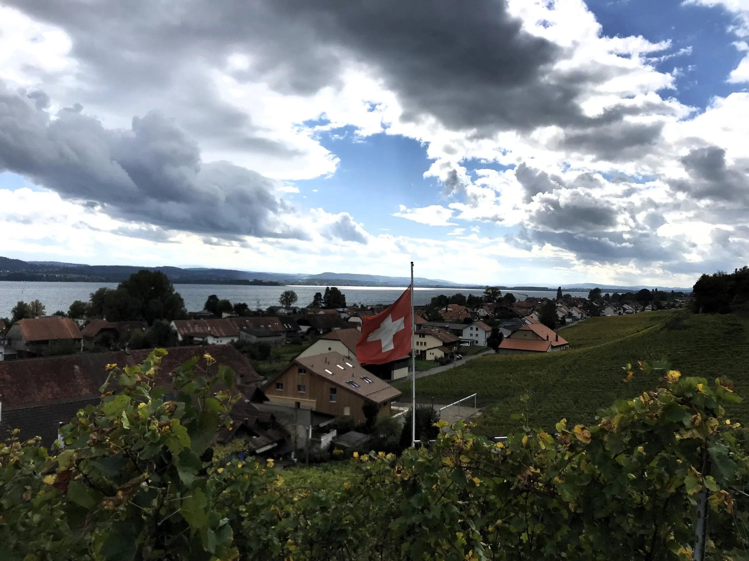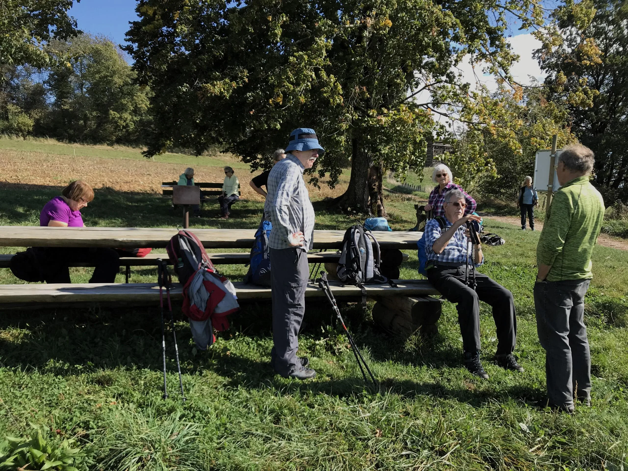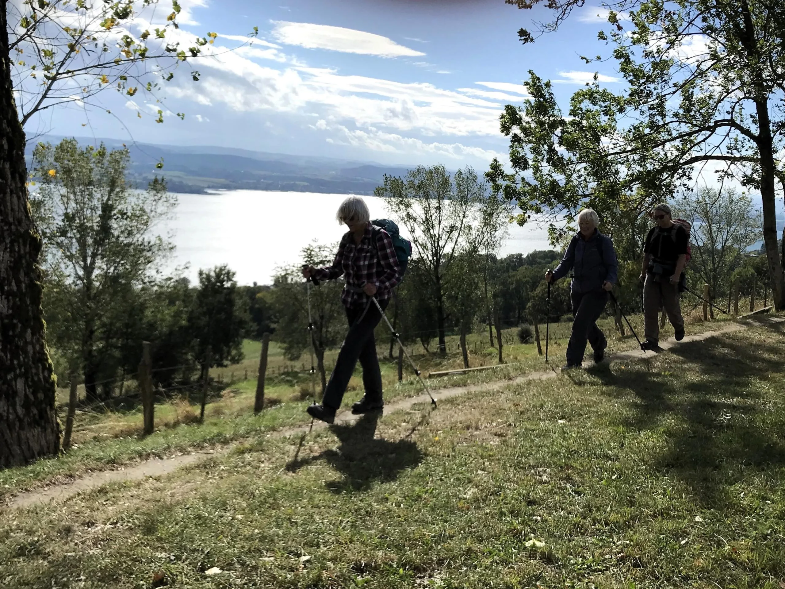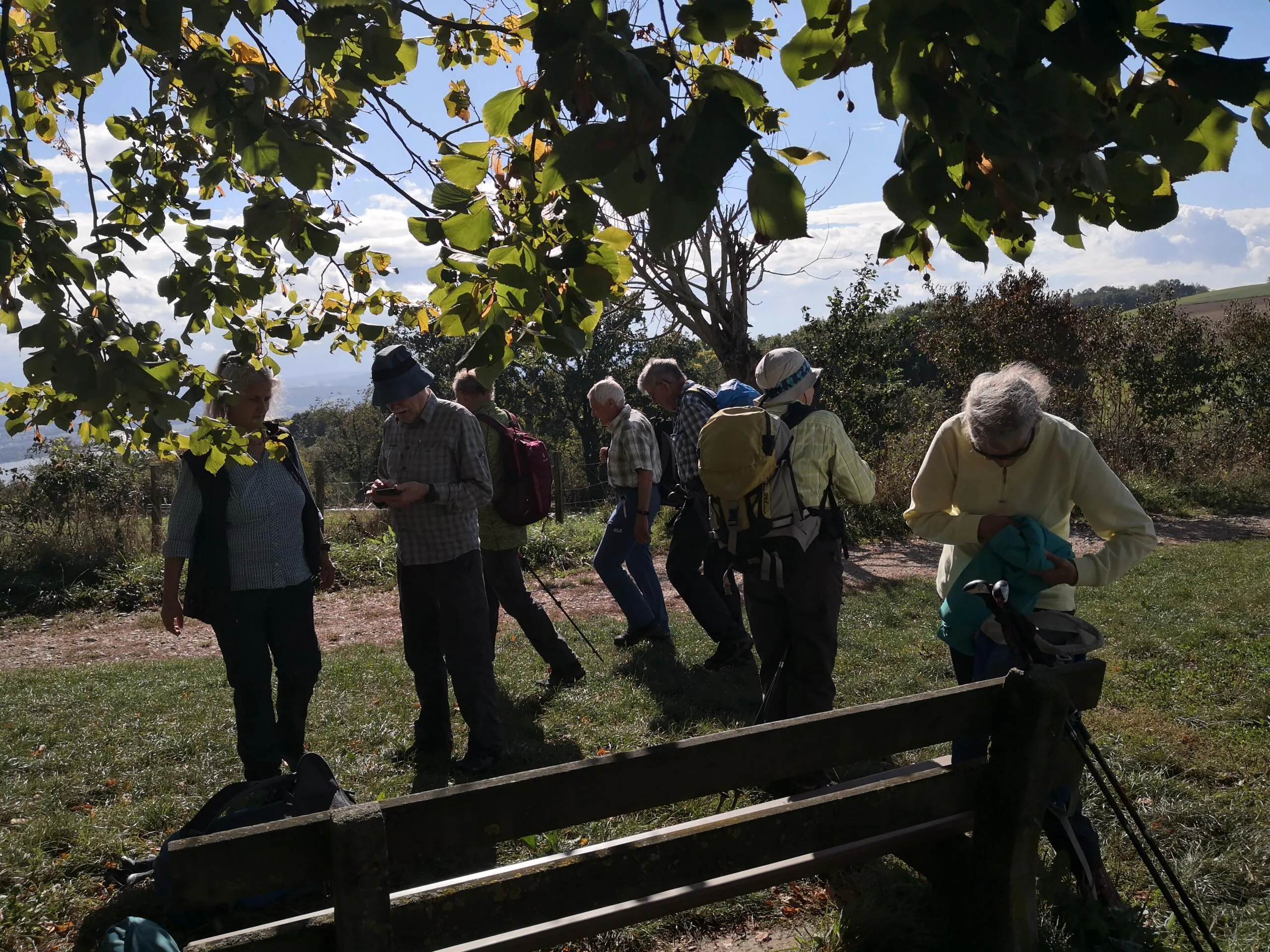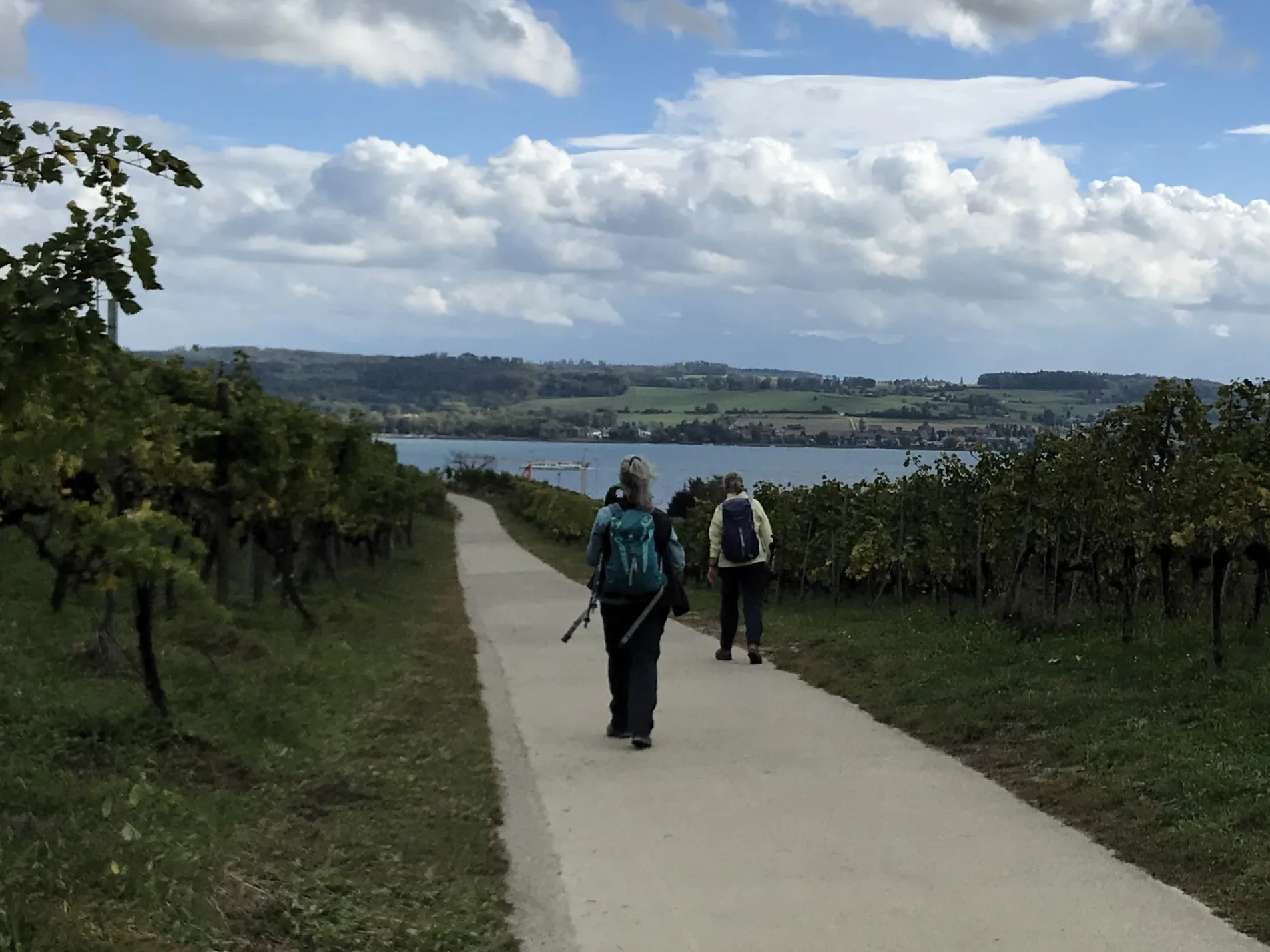 Um 09.00 Uhr treffen sich am Bahnhof Bern 11 Wanderfreudige. Der Wetterbericht prophezeit Regen… die Natur kann ihn gebrauchen. Wir fahren bis Cudrefin am Neuenburgersee, dort gibt’s wie üblich mal Kaffee. Regenschutz brauchen wir noch nicht. Zuerst wandern wir etwa 3 Kilometer dem See entlang bis La Sauge. Hier ist das Naturschutzgebiet der Grand Cariçaie, ein wichtiges Zwischenziel für die Vögel. Zwei Männer von uns versuchen die gerade Strecke in der halben Zeit zu laufen…. Sie warten jedoch schon auf die etwas Langsameren… Bald geht’s dem Broyekanal entlang. Die Wolken werden schwärzer und die ersten Regentropfen fallen. Doch es lohnt sich kaum, den Regenschutz anzuziehen. Vor dem Mont Vully machen wir Mittagshalt. Nach kürzerem Aufstieg sind wir bald auf dem Plateau oben mit den riesigen Ackerflächen. Im Westen werden die Wolken immer schwärzer, betrifft uns aber nicht. Es gibt noch einmal eine Pause bei den Überresten der Helvetier, die da mal gehaust haben. Nun wechseln wir auf die Murtensee Seite. Es geht ziemlich steil hinab durch die Rebberge. Bald ist Sugiez erreicht, natürlich darf dort ein Gâteau de Vully nicht fehlen…. Mit dem Zug geht’s wieder heimwärts. Danke an Kurt für die Organisation, jemand hatte auch noch mit dem Petrus geredet und uns kaum Regen trotz den Wetterprognosen beschert. K.F.